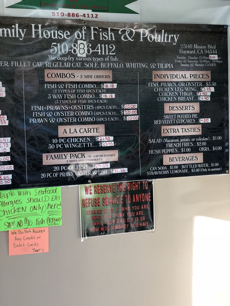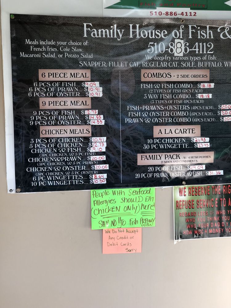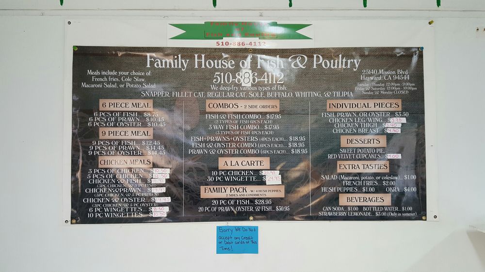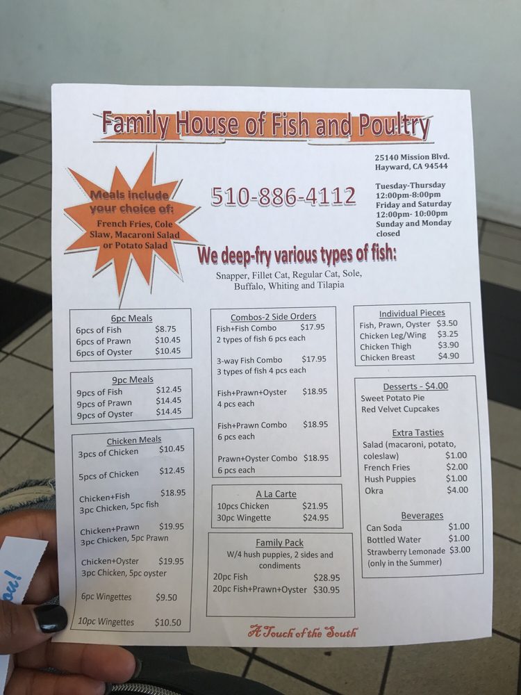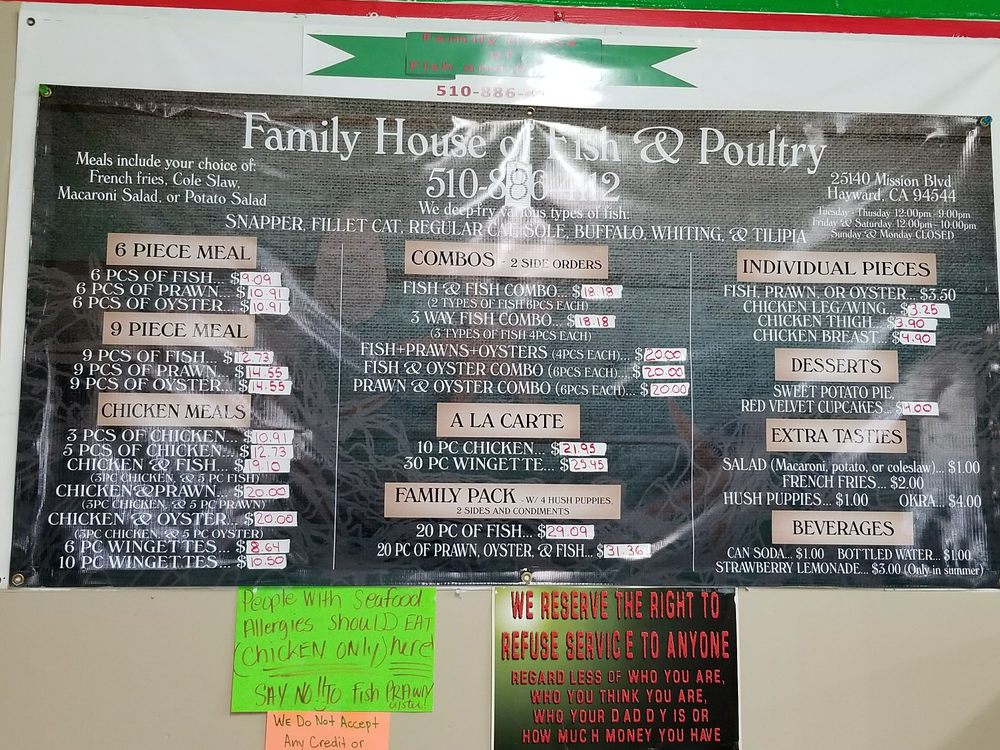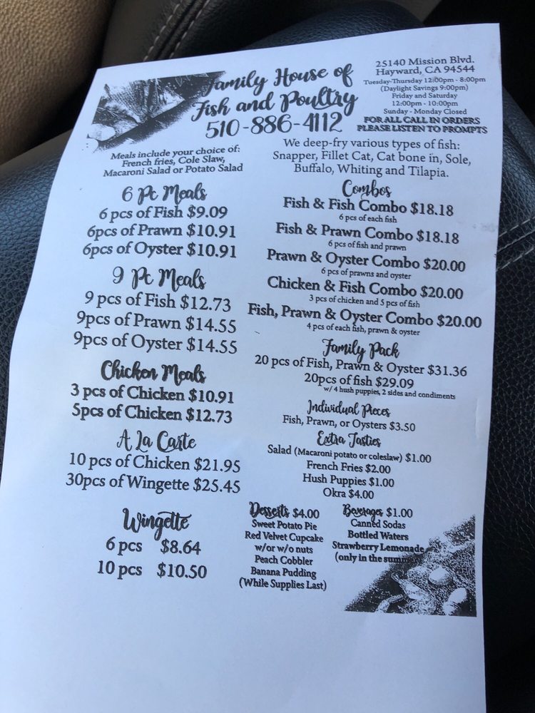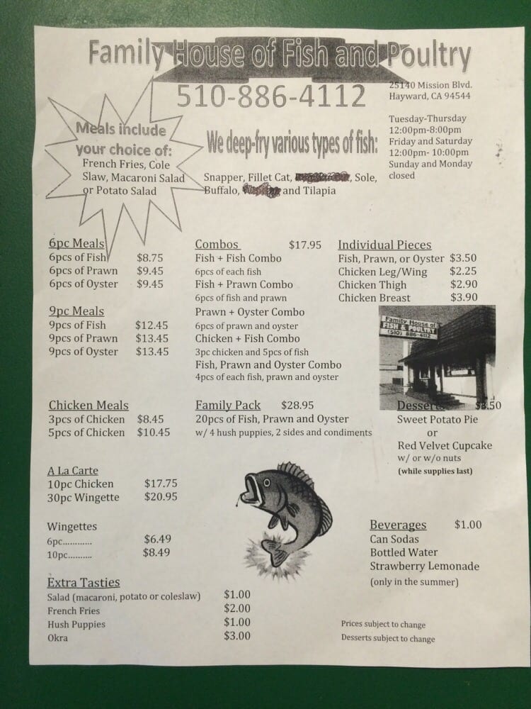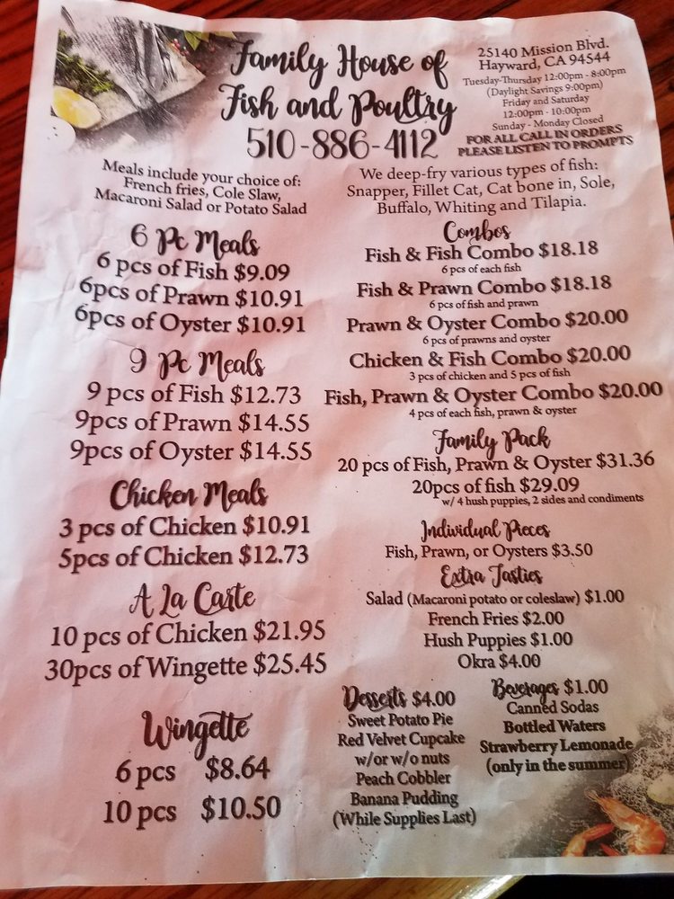 Introducing the menu at Family House of Fish and Poultry, located in Hayward, CA, where they specialize in Fish & Chips, Soul Food, and Seafood. This family-owned restaurant offers a variety of options like fried red snapper, spicy shrimp, tilapia, catfish, and chicken wings. Customers rave about the well-seasoned and crispy dishes, with reviews praising the freshness and light breading of the seafood. The menu also includes vegetarian options and comfort food desserts. With the option for takeout and catering, this casual dining spot is great for groups and families. The attentive service and cozy ambiance make it a perfect spot for a tasty and satisfying meal. Don't miss out on trying their delicious seafood and hearty comfort dishes if you're in the Hayward area.
