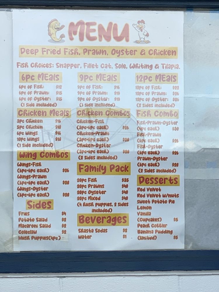 pcs fish - Fried selection of snapper, fillet cat, sole, tilapia. Choose any two sides: fries, potato salad, macaroni salad, coleslaw. Perfect for sharing.